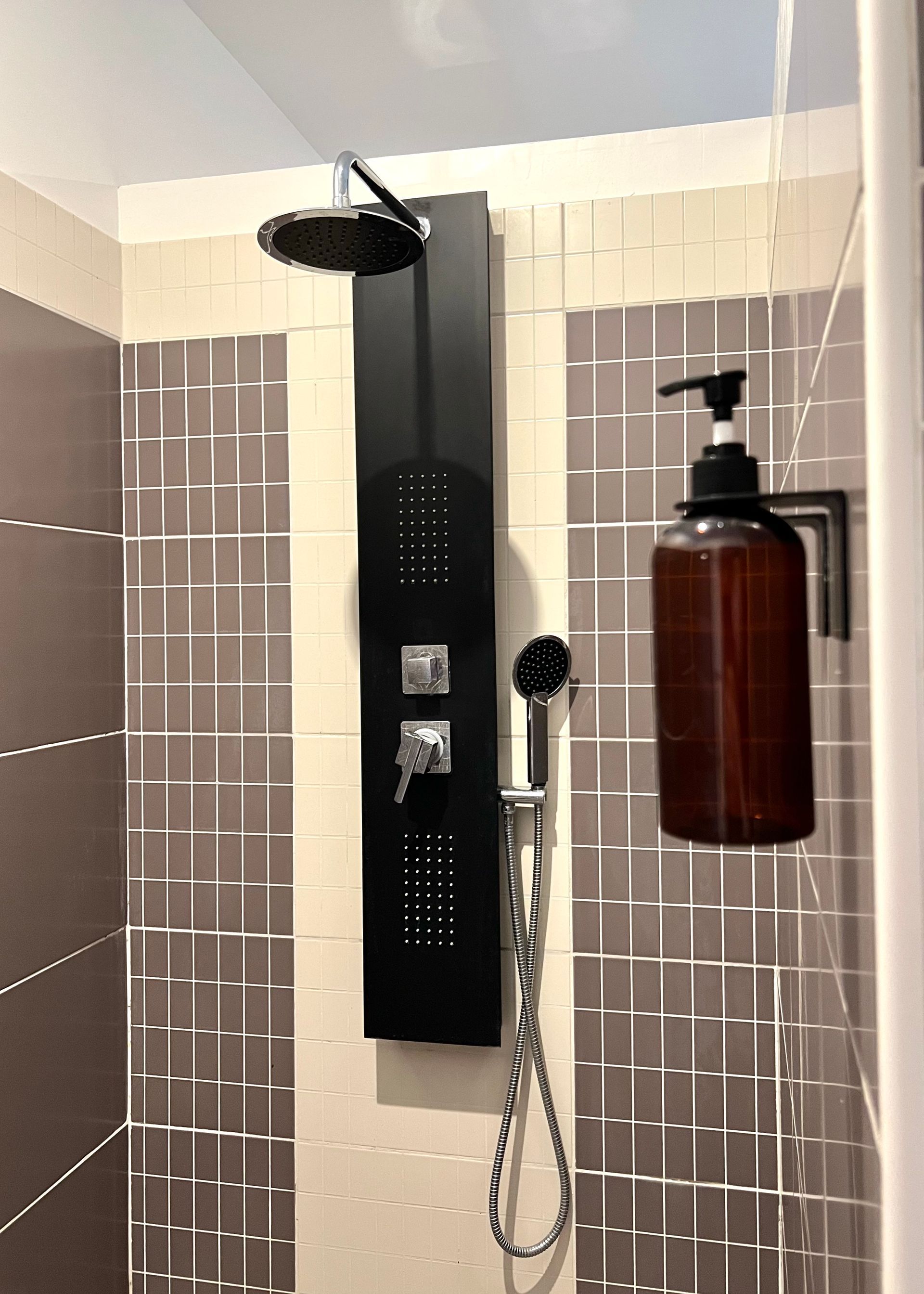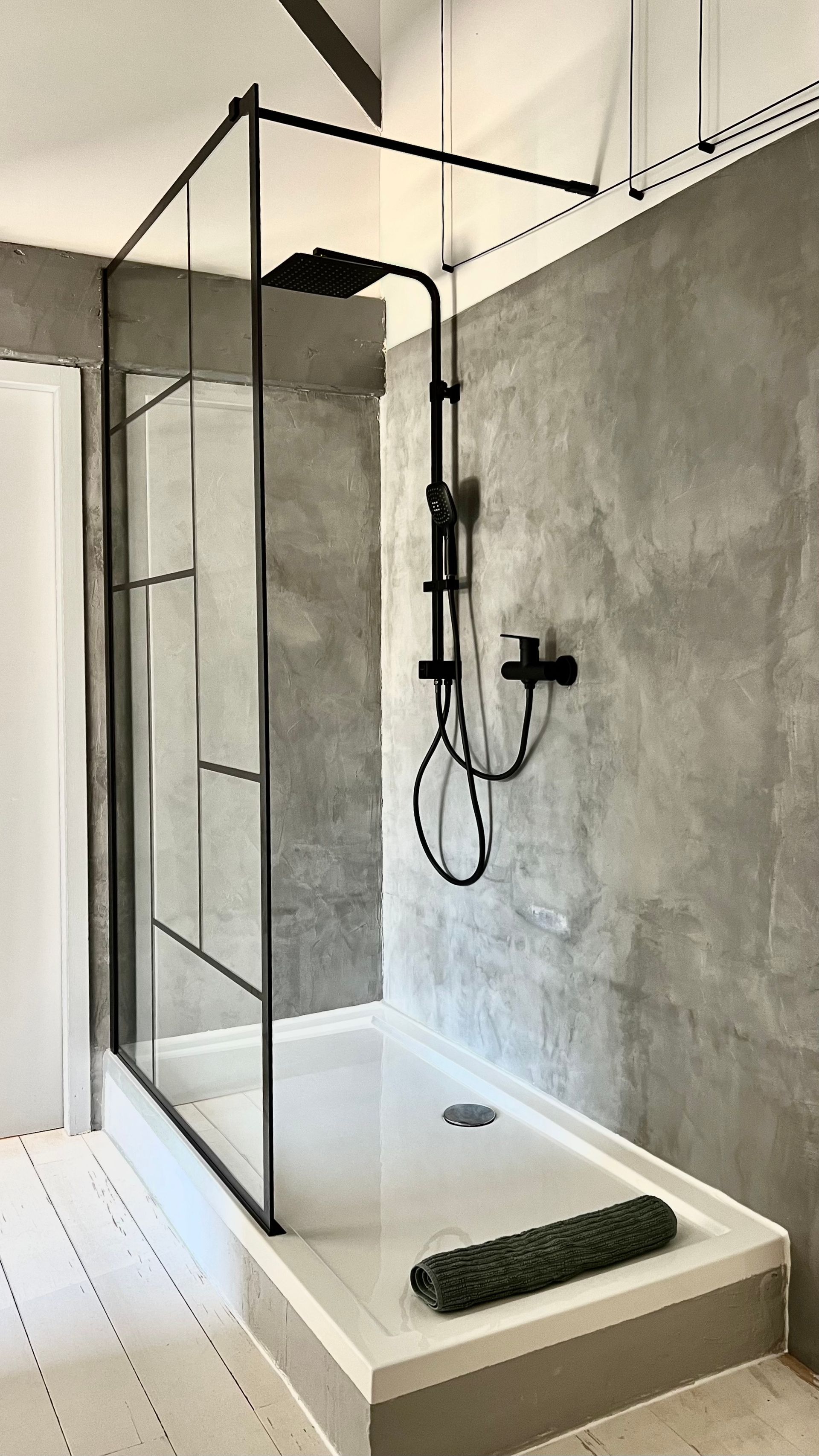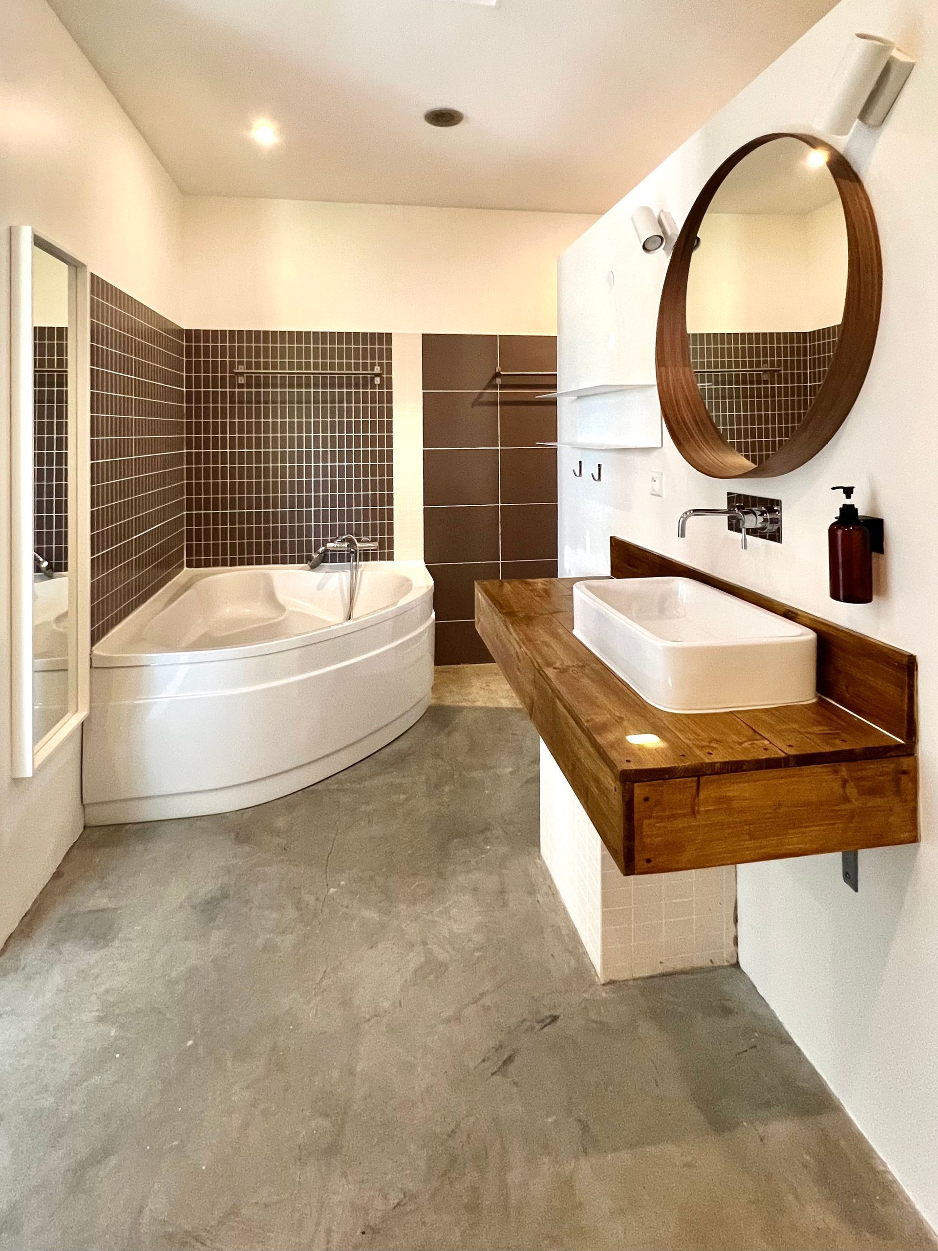 There you will find a sink, the shower, the toilet and even a large bathtub.