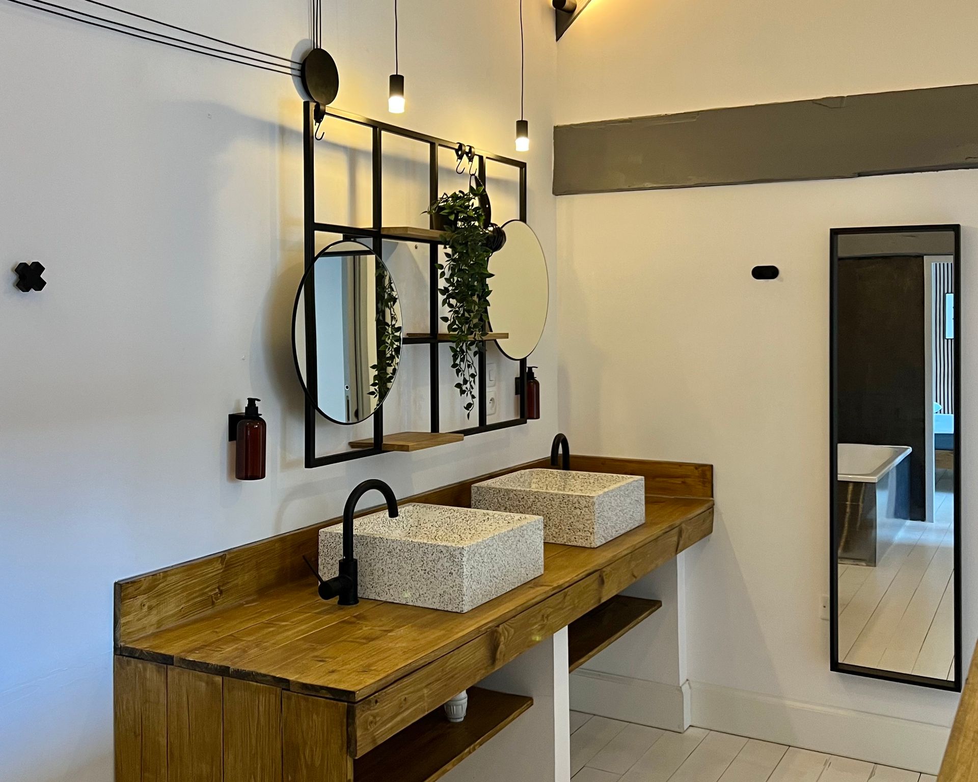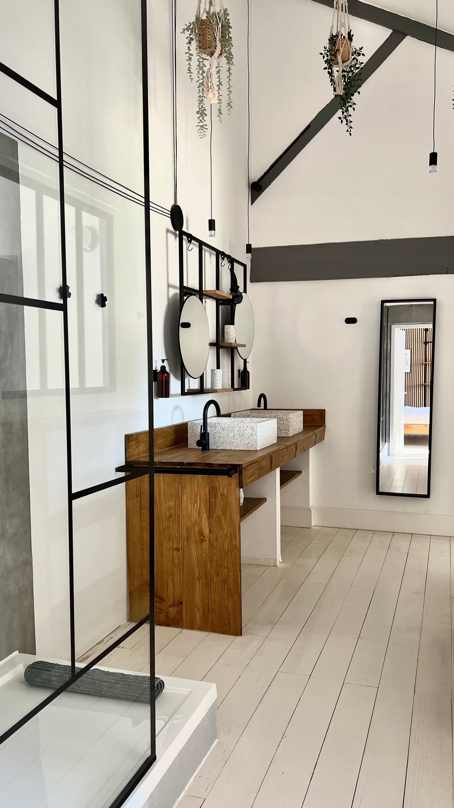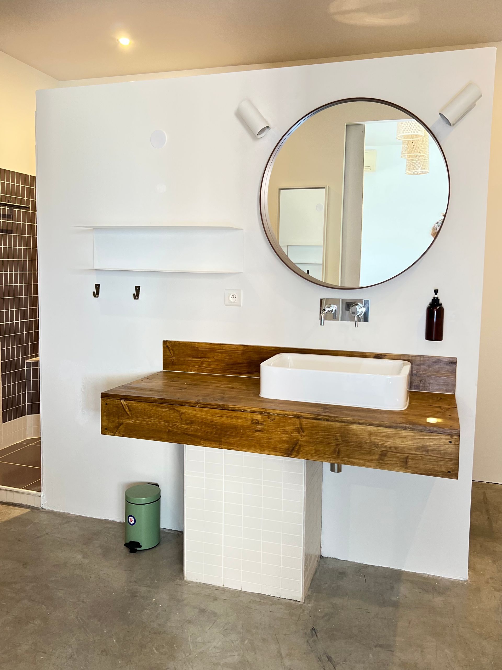 There you will find a sink, the shower, the toilet and even a large bathtub.