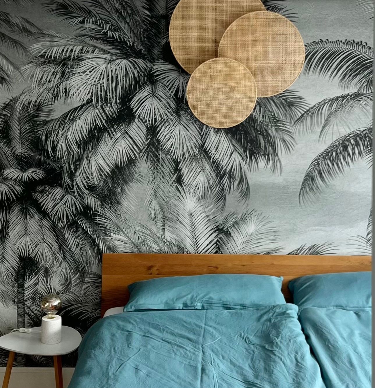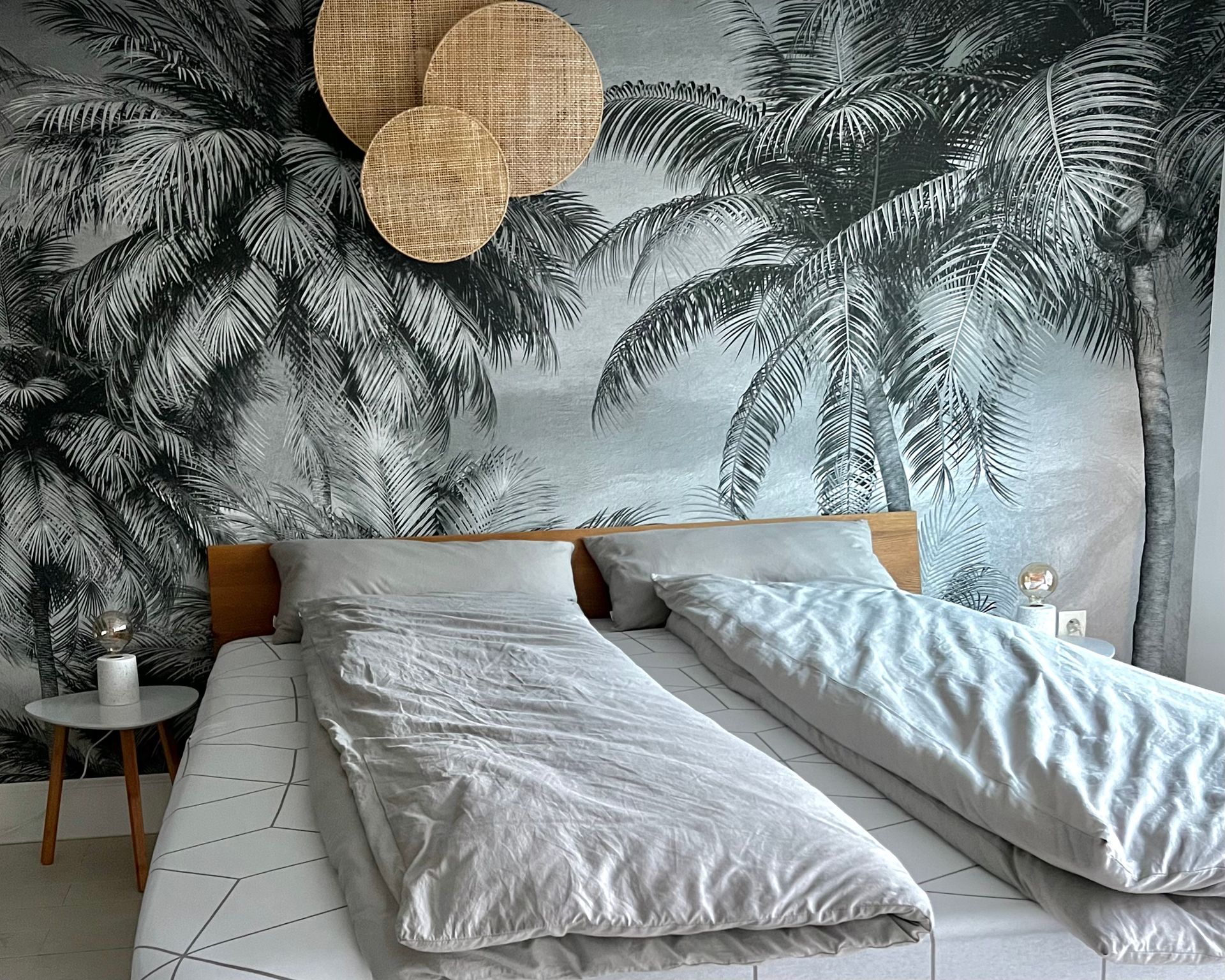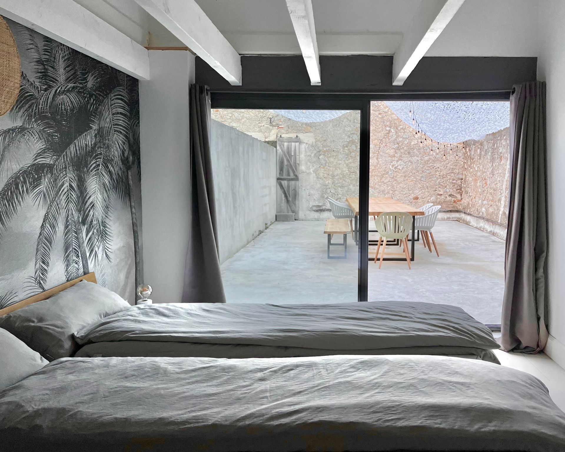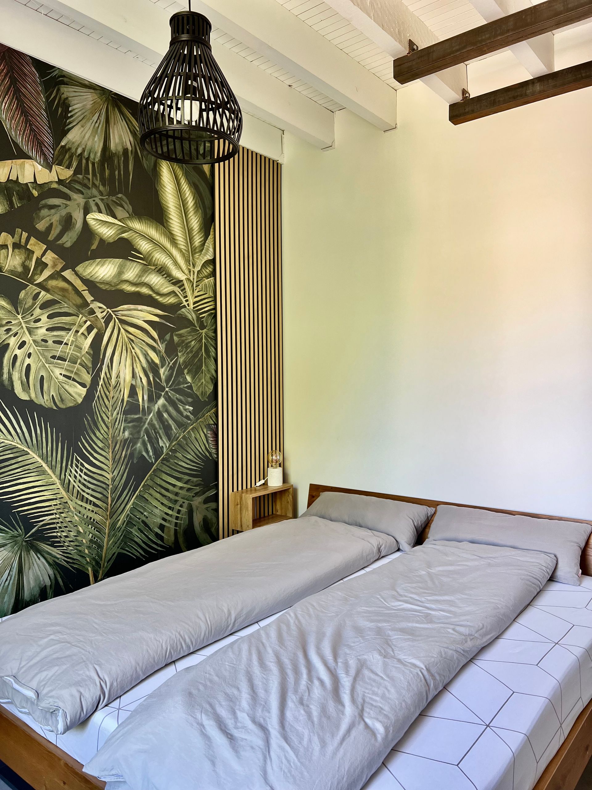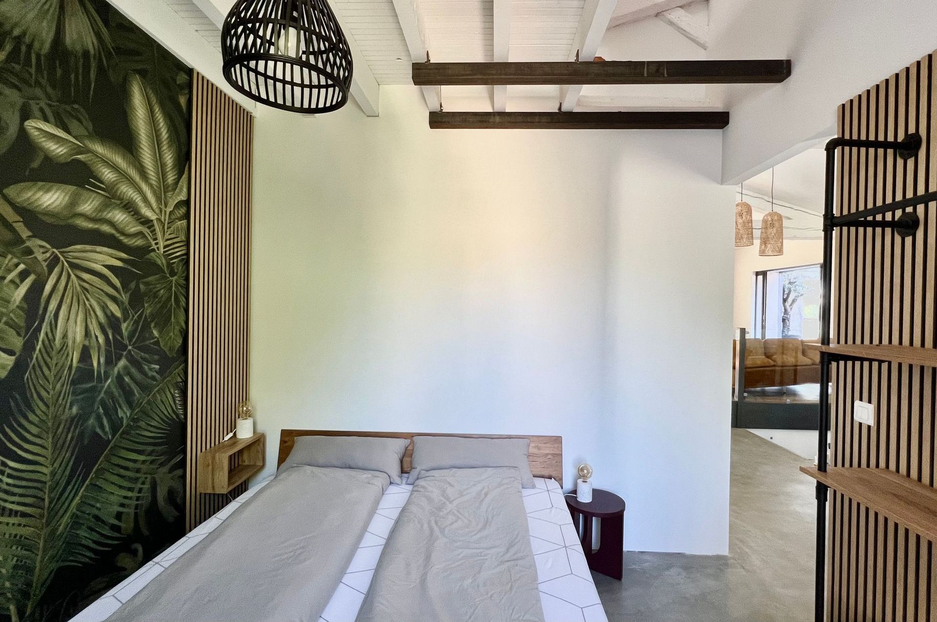 The first bedroom in the north wing has a beach design and is adjacent to the large terrace with the long dining table. The camouflage net there conjures up wonderful shadow plays on the king-size double bed in the morning.