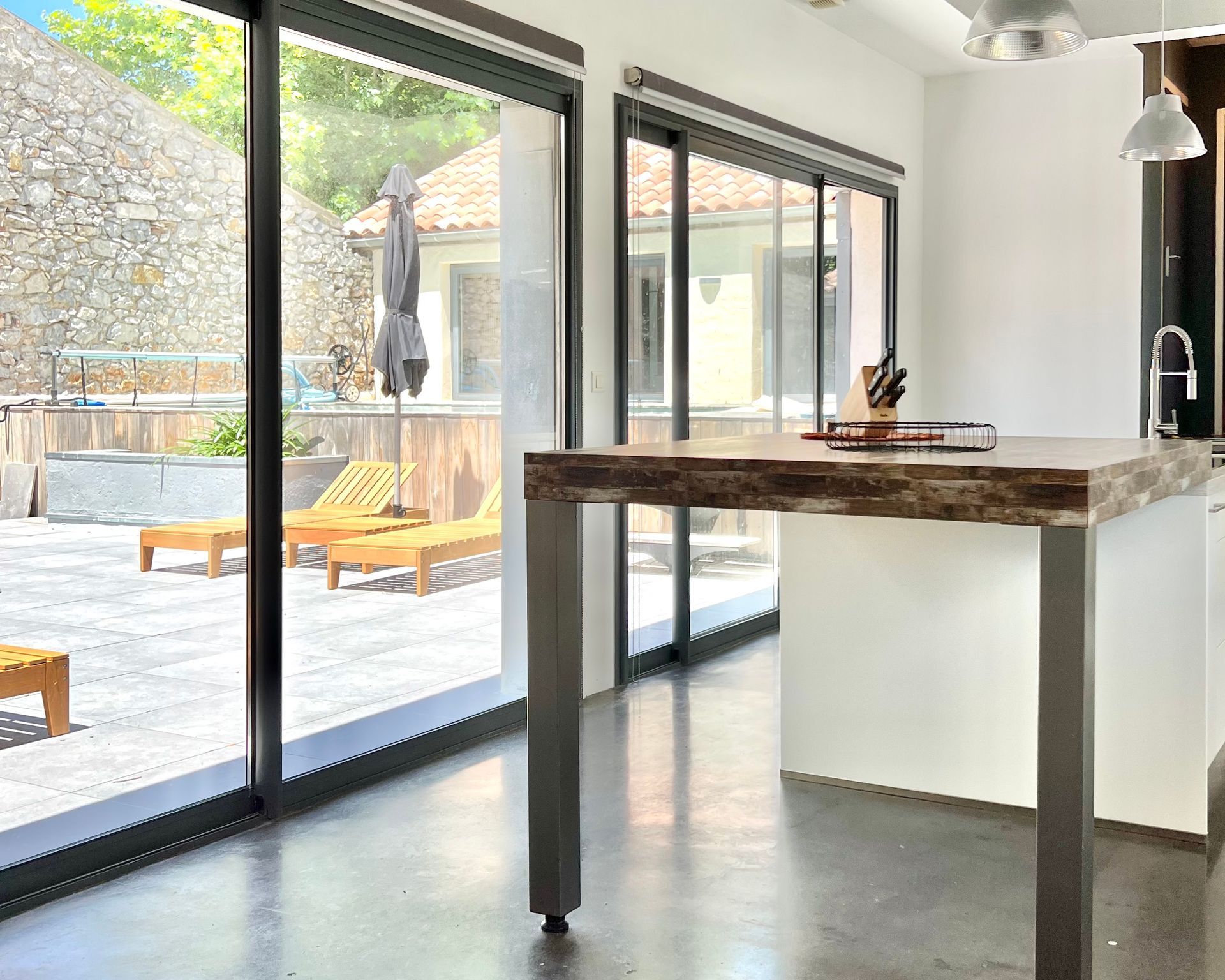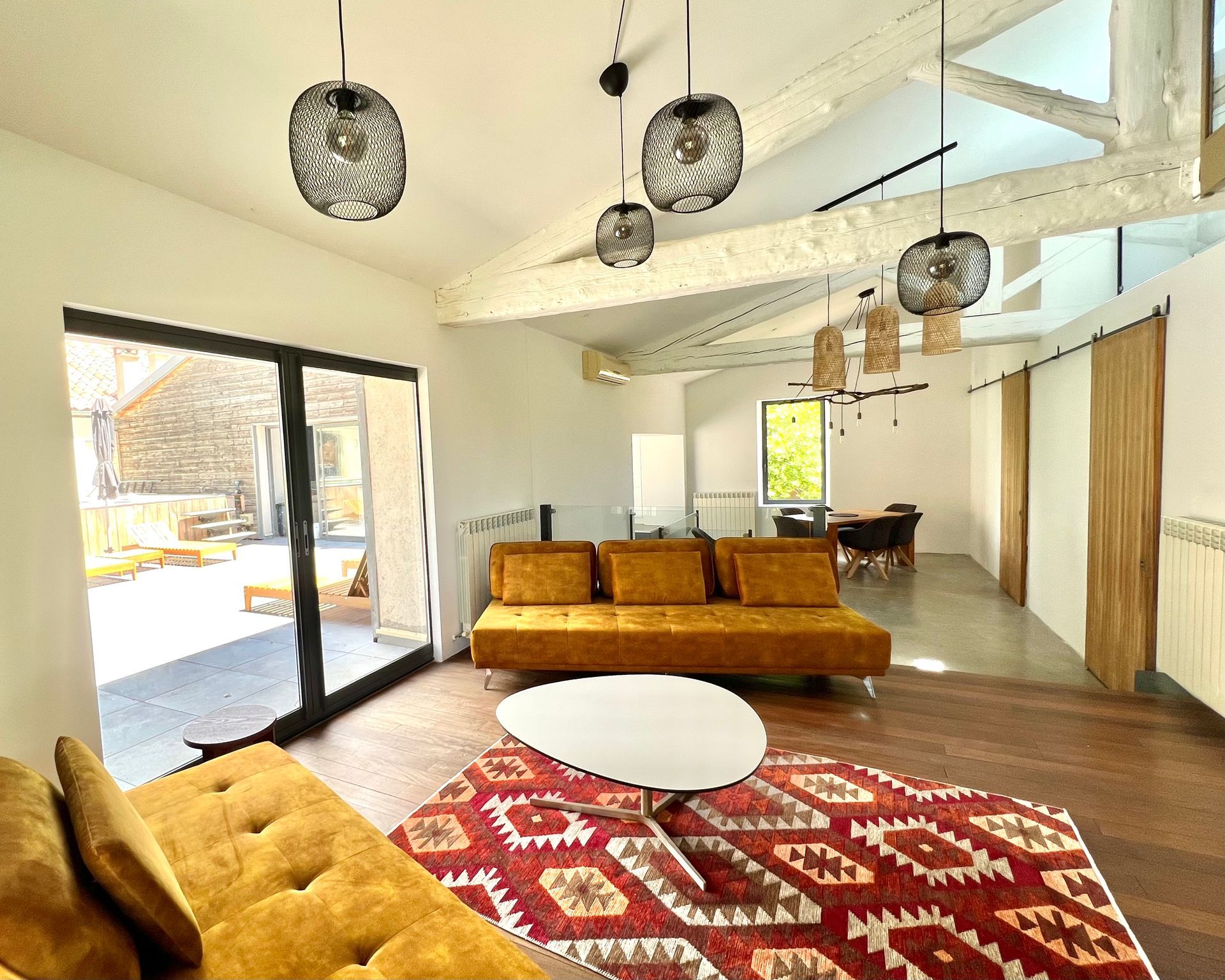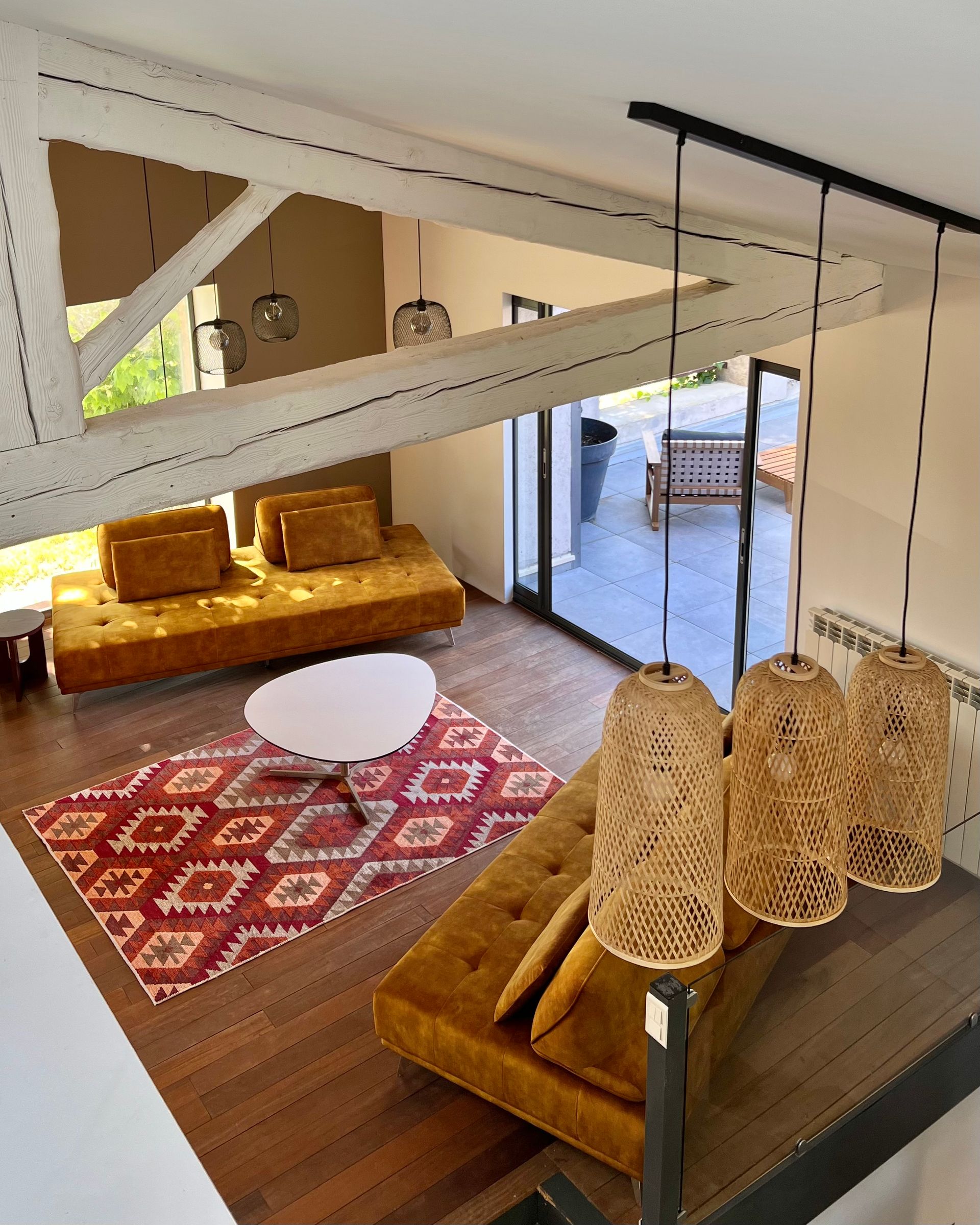 The large living room is spread over two floors and offers great views of the vineyards, the Canal de la Robine or the terrace with the private pool and loungers.