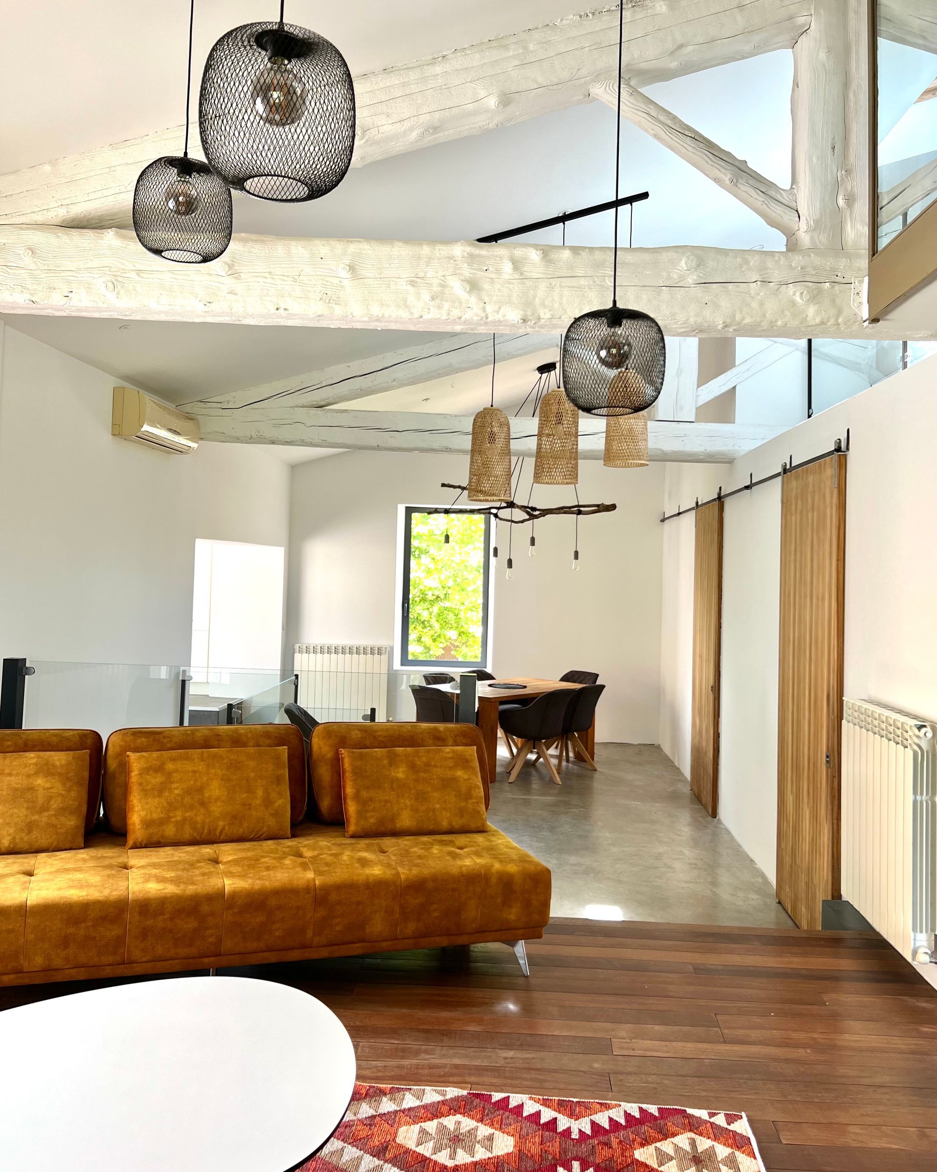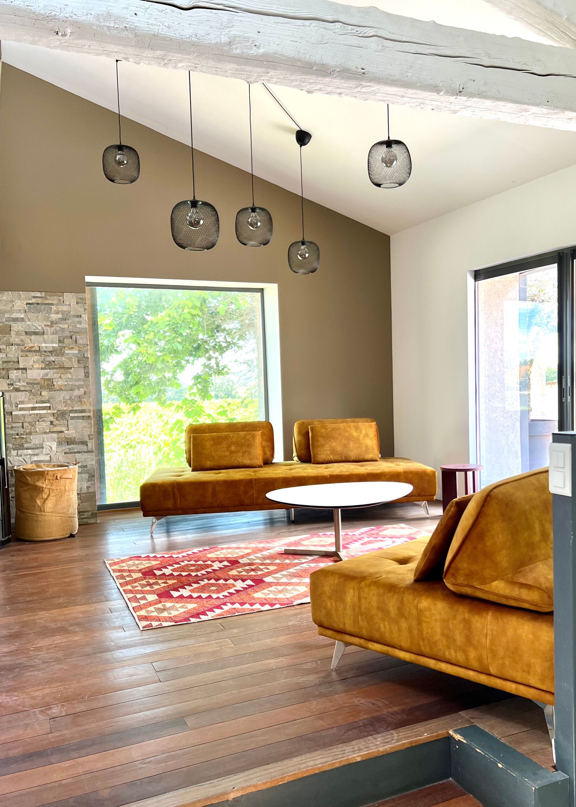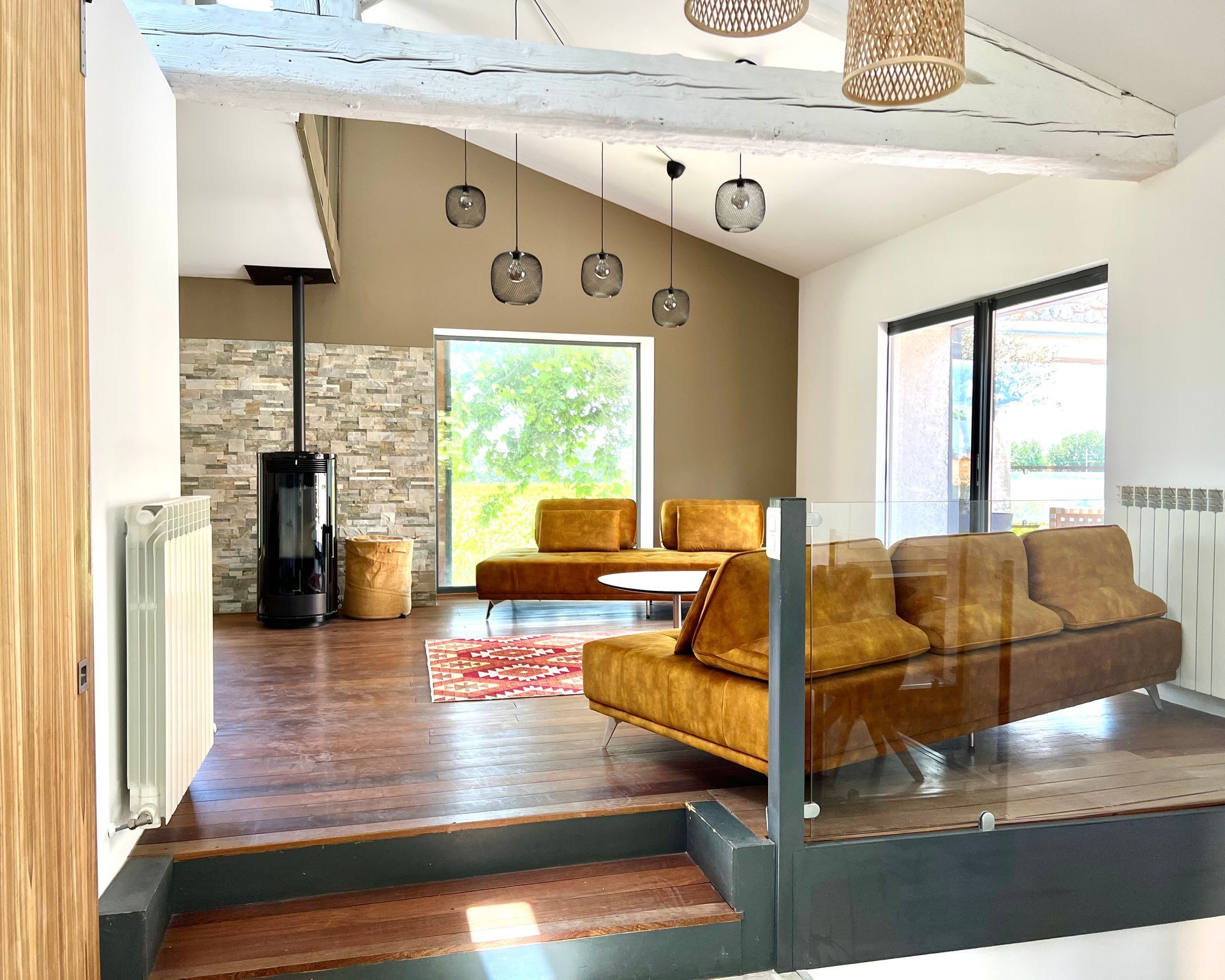 The large living room is spread over two floors and offers great views of the vineyards, the Canal de la Robine or the terrace with the private pool and loungers.