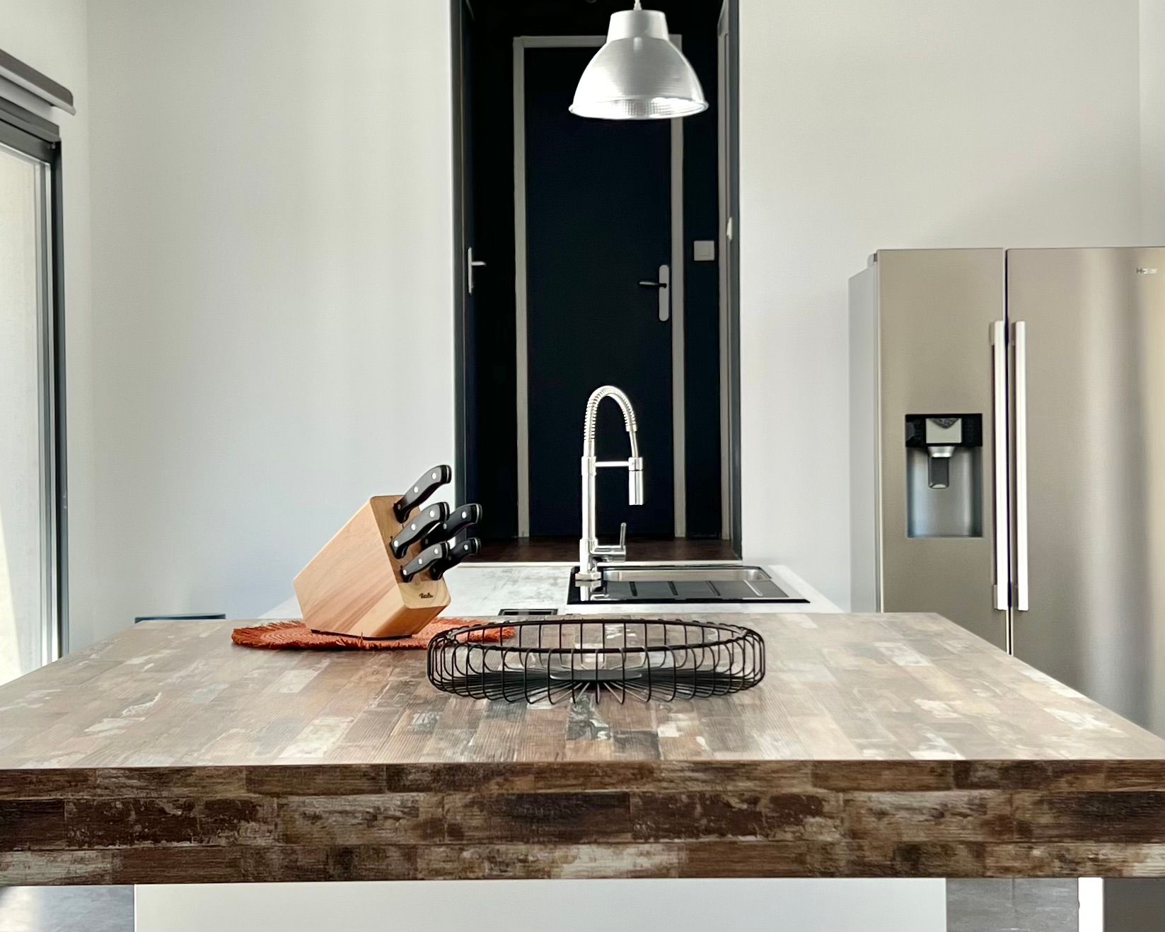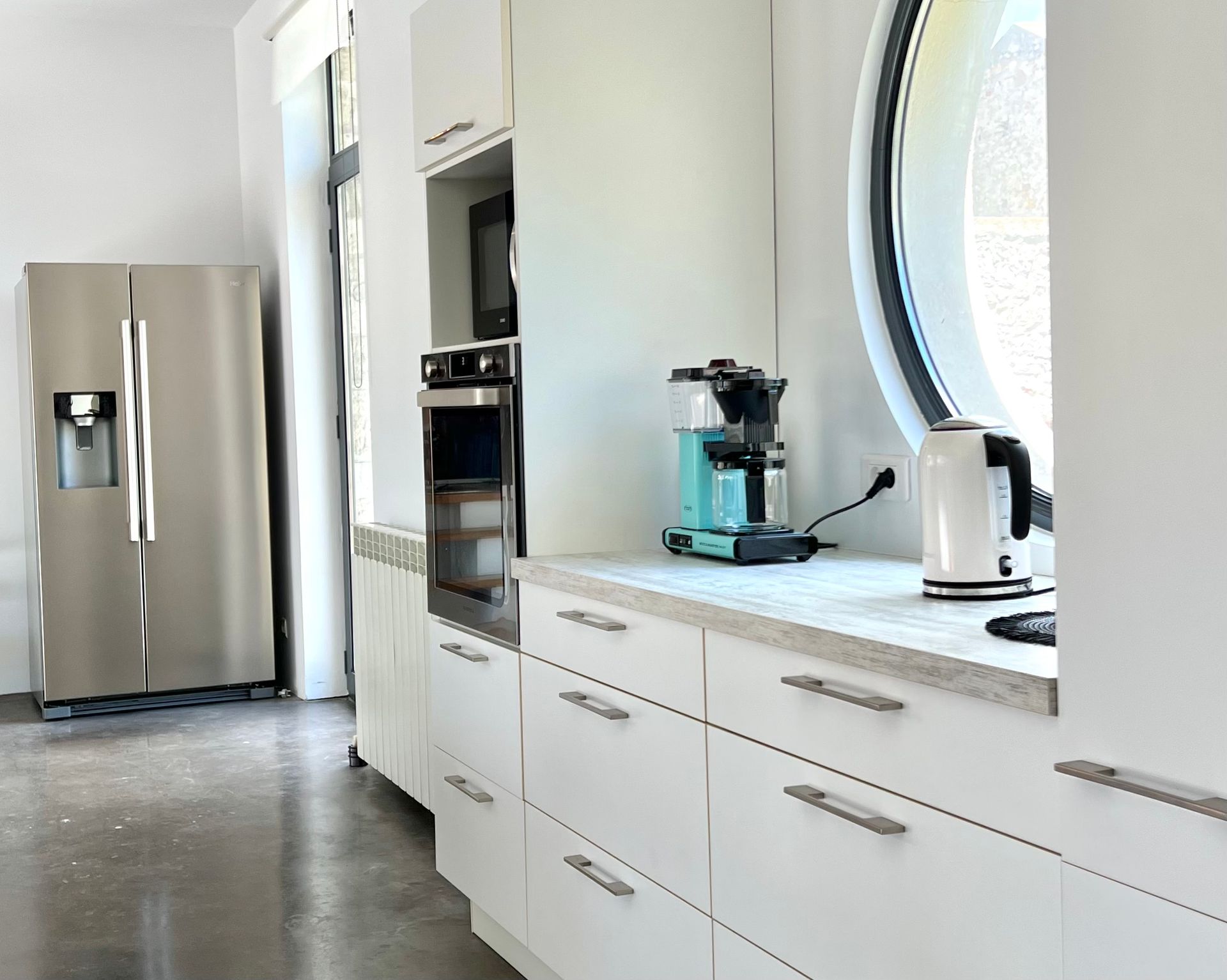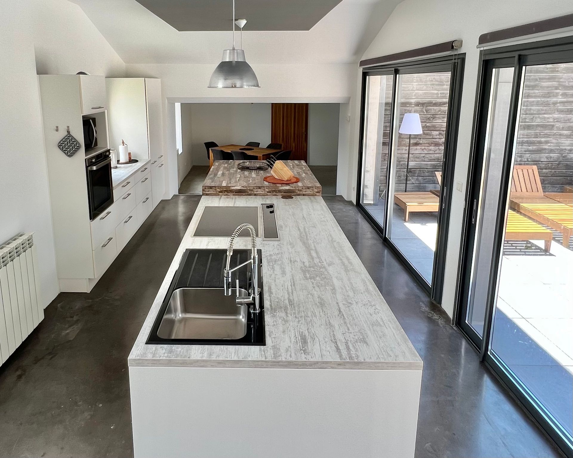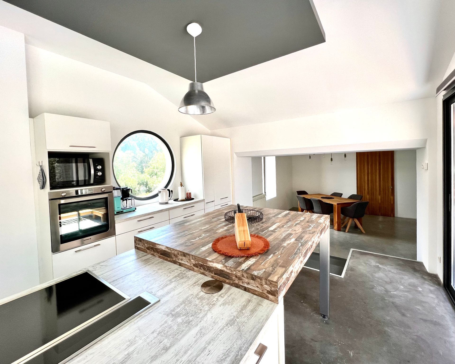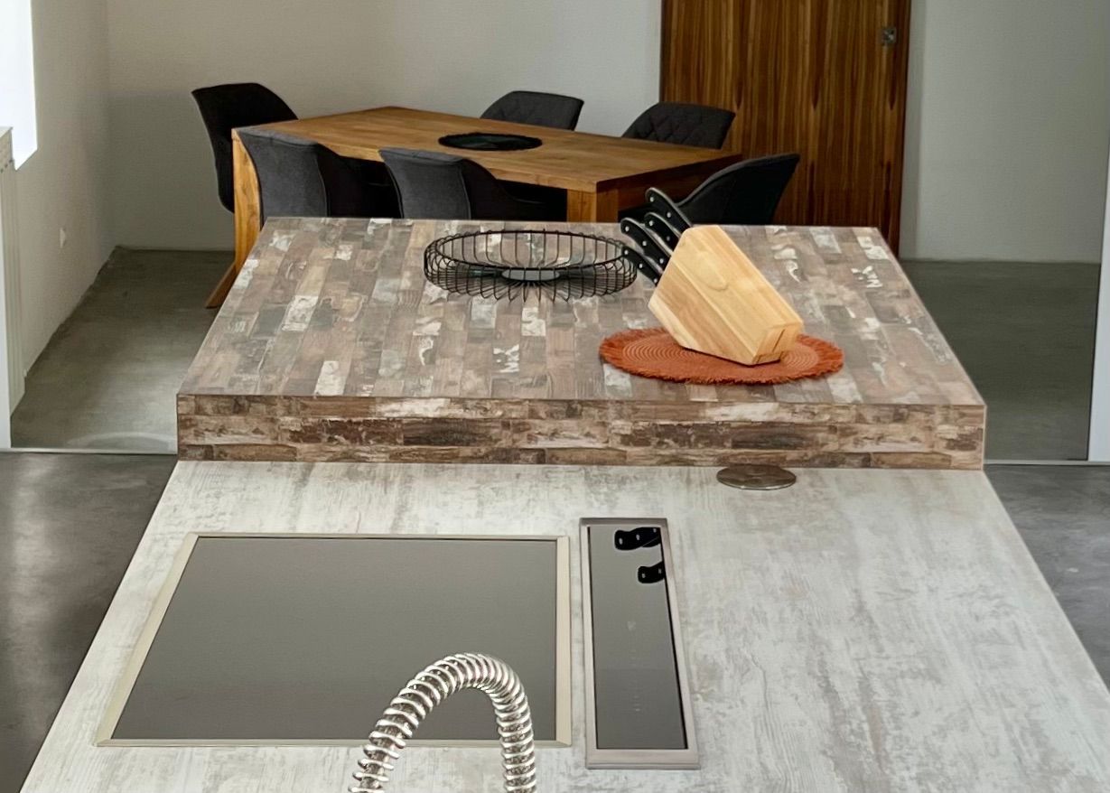 The kitchen is fully equipped and, along with the pool terrace, forms the center of the penthouse. It connects the south wing with the north wing and lets you see the vineyards.